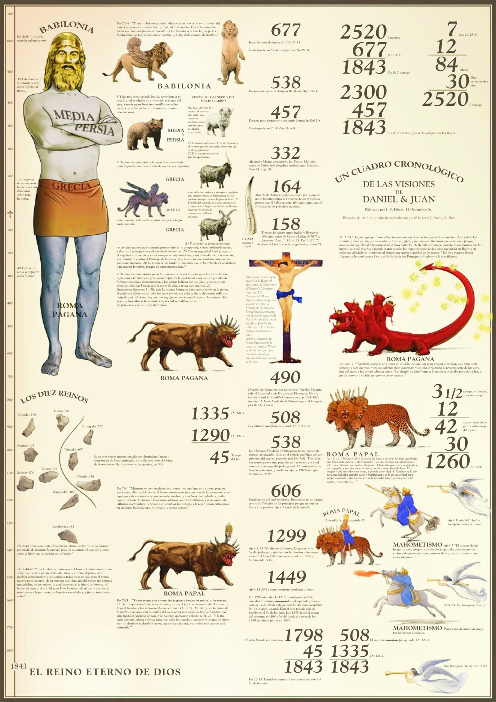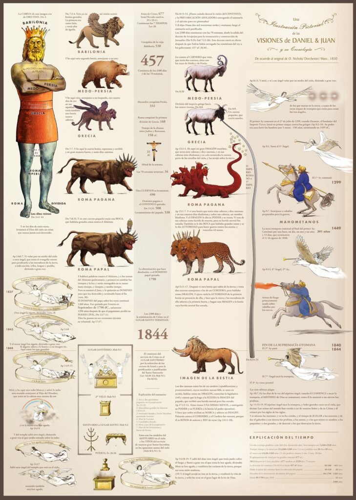 Los libros de Daniel y el Apocalipsis son uno. El primero es una profecía; el otro, una revelación; uno es un libro sellado; el otro, un libro abierto… La luz especial que se le dio a Juan, expresada en los siete truenos, era un bosquejo de sucesos (delineación de eventos), que debían ocurrir bajo los Mensajes del Primero y Segundo Ángeles. Los mensajes de los ángeles primero y segundo debían ser proclamados; pero no había de revelarse mayor luz antes que esos mensajes hubiesen hecho su obra específica… Este tiempo, el que el ángel declara con un solemne juramento, no es el fin de la historia del mundo ni del tiempo de gracia, sino del tiempo profético que precederá al advenimiento de nuestro Señor; es decir, la gente no tendrá otro mensaje acerca de un tiempo definido. Después de este lapso, que ahora abarca desde 1842 a 1844, no puede haber ningún cómputo definido de tiempo profético. El cálculo más prolongado llega hasta el otoño de 1844.